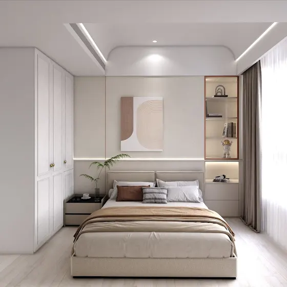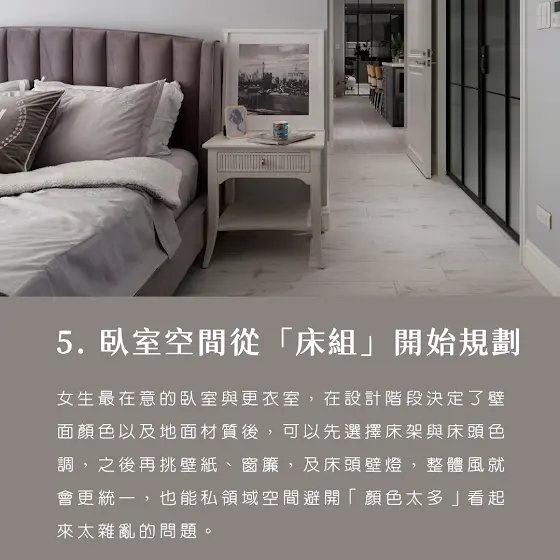 臥室以柔和的中性色為基調,