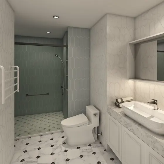 - 主浴(含浴缸)選用人字拼貼與花磚拼接,