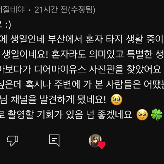 우리 구독자 여러분들은제 콘텐츠 중 어떤 것을 늘 기다려주시나요~? ଘ(੭´・ᵕ・ )੭뭔가 꾸준히 하고 있음에도 불구하고컨텐츠의 질이 떨어지는 것 같이 느껴져서 ㅠㅠ여러분과 소통하며 의견을 듣고싶어요 !보고싶은 컨텐츠도 댓글 남겨주시면제작에 도움이 많이 될 것 같아요…. ❤︎