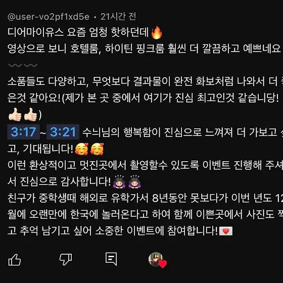 💙디어마이유스 촬영권 당첨자 발표💙은승윤아초코찐빵헤헤삐뚤어질테야박경민이렇게 다섯 분 축하드립니다 !!제 메일 주소로 닉네임이 나와있는 본인 프로필 스크린샷과 함께 스튜디오 예약 예정자 성함 / 휴대폰 번호 뒷자리 보내주시면 자세한 안내사항 연락드릴게요 ଘ(੭*ˊᵕˋ)੭»ㅡ❥참여해주셔서 감사합니다 🍀📩 daa96111@naver.com※ 이번 주 주말까지 메일 부탁드립니다! 연락 없을 시 재선정해서 올리겠습니다 :)