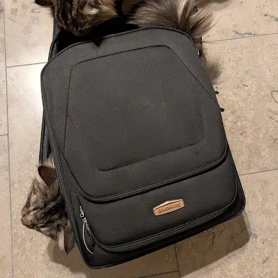 Moss loves suitcases...We only need to unzip it and he finds his way in. Then he sticks out his head and tail like this and he's satisfied. π