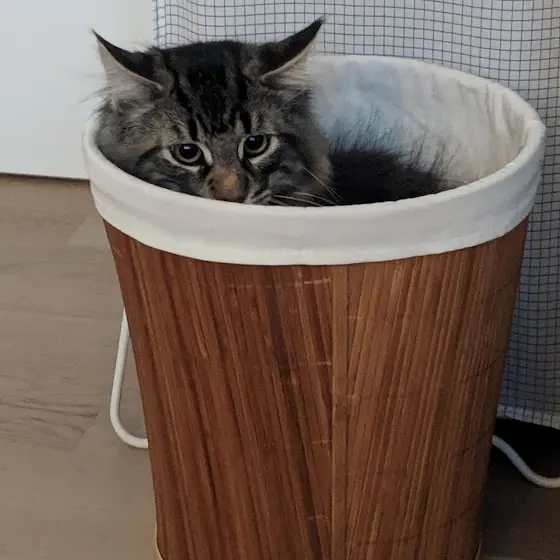 This is the first picture of Roy when he and Moss moved in. This was the first thing he did, and knowing Roy, this may not come as a surprise: He wasn't hiding from stress or fear at all. He was simply playing with the basket, and within minutes, our home was turned upside down. π