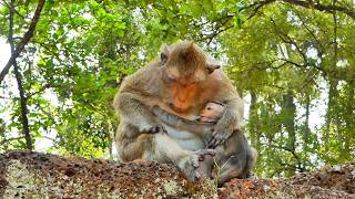 A mother monkey gently cradles her newborn in the forest.