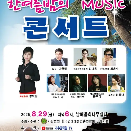금쪽같은 #내님사랑 의 명품유친님들 안녕하세요?#수요일#일요일의 #여인#내님사랑#강덕임은#경남남해군에서 펼쳐지는 #한여름밤의 🎵뮤직콘서트🎵에 초대합니당.그동안 폭염과 삶에 지친 몸과 마음 잠시 내려놓으시고#낭만과 #여행도즐기시고 #영양보충도 하시고 가실수있는 좋은기회라봅니다.#내님사랑 은 명품의 유친님들과 항상 언제나 함께합니다.언제나 ❤️알라뷰 ❤️입니당 ⚘️💋#무조건 사랑❤️건강입니다❤️❤️❤️