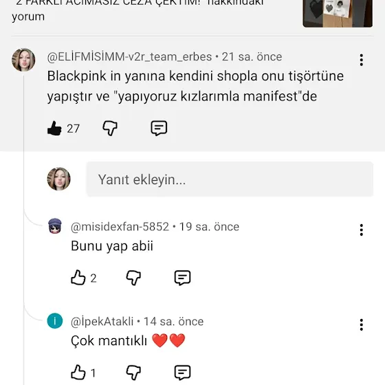 selam ben elif takma ismim ile misha(mişa) eğer bunu okuyorsan ilgini çekmişimdir Pp ye aldırma evet manifest fanıyım ve biasım da Sueda fakat onu o yüzden değil Sueda ya NEXT sulli denildiği için koydum manifam ım dedim diye beni bp antisi sanma BLACKPİNK de seviyorum biasım jennie hatta şimdi sana kanal durumunu göstereyim