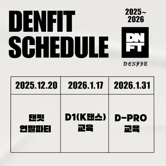 ๋ํ D-1 ๊ฐ์ฌ๊ต์ก ์๋ด: K๋์ค๋ฆฌ๋ฌ & Denpop15๊ธฐ ๋ํ ๊ฐ์ฌ๊ต์ก์ ์๋ด๋๋ฆฝ๋๋ค.-๋ํ ์๊ฐ-๋ํ์ 1998๋ ๋ถํฐ ๋์ค ๊ต์ก์ ๊ธฐ๋ฐ์ผ๋ก ์ฑ์ฅํด์จ ์ ๋ฌธ ๋ธ๋๋์ ๋๋ค. 25๋ ์ด์์ ํ์ฅ ๋ ธํ์ฐ์ ์๋ง์ ํ์ ๊ฒฝํ์ ๋ฐํ์ผ๋ก ๋์์์ด ์งํํ๊ณ ์์ต๋๋ค.Denpop์ K-POP ์๋ฌด์ ์ฌ์ด ๋ฒ์ ์ฅ๋ฅด๋ก, ํ์ฅ์์ ๋๊ตฌ๋ ์ฝ๊ฒ ์ ์ฉํ ์ ์๋๋ก ๊ตฌ์ฑ๋ ๋ํ๋ง์ ํธ๋ ๋ํ ์ฝํ ์ธ ์ ๋๋ค.-๊ต์ก ๊ฐ์ * ์ผ์: 2026๋ 1์ 17์ผ(ํ ) ์ค์ 10์ ~ ์คํ 2์ (์ด 4์๊ฐ) * ์ฅ์: OGDANCE (์์์ ์ํต๊ตฌ ๋์๋๋ก 1699, ์ํต๋น๋ฉ 4์ธต) * ๊ต์ก ๋ด์ฉ: K๋์ค๋ฆฌ๋ฌ ์คํ , Denpop๊ฐ์ฌ์ง ๋ฐ ๊ต์ก ํน์ง๋ํ ๊ต์ก ๊ฐ์ฌ์ง์ ํ์ฅ์์ ์๋ง์ ํ์๋ค๊ณผ ํธํกํ๋ฉฐ ๊ฒฝํ์ ์์์จ ์ค์ ์ค์ฌ์ ์ ๋ฌธ๊ฐ๋ค๋ก ๊ตฌ์ฑ๋์ด ์์ต๋๋ค. ๊ฐ์ฌ๋๋ค์ ๋๋์ด์ ๋ง์ถ ๊ต์ก์ผ๋ก ๋ฐ๋ก ํ์ฅ์ ์ ์ฉ ๊ฐ๋ฅํ ์ค์ ๋ ธํ์ฐ๋ฅผ ์ ๋ฌํฉ๋๋ค.-์ ์ฒญ ๋ฐ ๋ฌธ์ * ์ ์ฒญ ๋ฐฉ๋ฒ: ์นด์นด์คํก ID denfit98 ์ถ๊ฐ ํ, ๋ค์ ์ ๋ณด๋ฅผ ๋จ๊ฒจ์ฃผ์ธ์. > ์ฑํจ / ์ฐ๋ฝ์ฒ / ์๋ฃ์ฆ ์๋ฌธ์ด๋ฆ / ์ง์ / ๊ฑฐ์ฃผ์ง์ญ * ์ฃผ์ ์ฌํญ: ์ ์ฌ์๊ฐ์ ์์ต๋๋ค. * ์ฃผ์ฐจ: ์ฃผ์ฐจ ๊ฐ๋ฅ * ์นด์นด์ค์ฑ๋: denfit98 * ๋ฌธ์: 010-4667-1015 * ํํ์ด์ง: www.denfit.kr