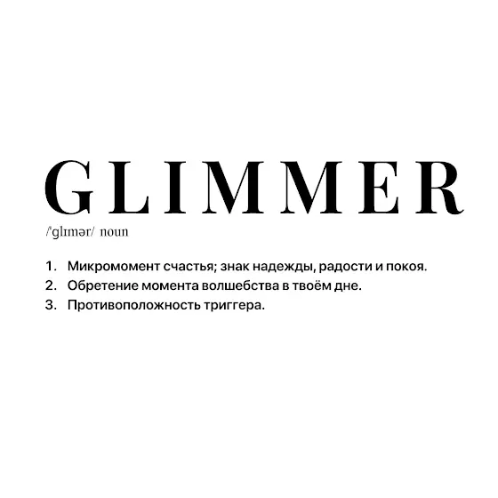 Недавно ко мне пришло очень глубокое осознание, что жизнь в целом - это охота за этими glimmers: счастливыми, радостными моментами. Мы приходим в этот мир, находим их, проживаем… и идём дальше.