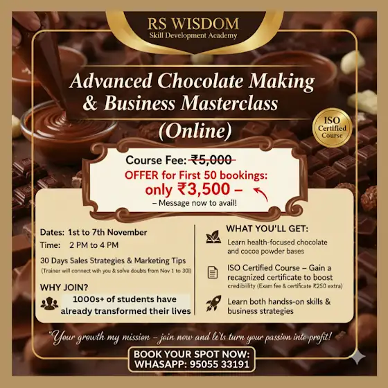 Advanced chocolate making & Business Masterclass bookings open 9505533191 whatsapp.