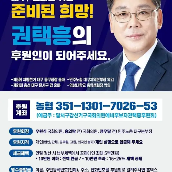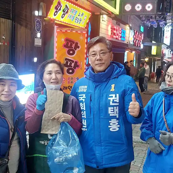 권택흥은 대통령직속 일자리위원회 청년TF위원, 더불어민주당 정책위 부의장, 대구경북발전특별위원회 위원 등을 지내며 정치를 배웠습니다. 21대 총선에서 국힘 후보, 무소속 국회의원 등 6명과 경합하여 2등으로 낙선을 했지만, 대구에서 민주당과 지역을 지켜왔습니다.