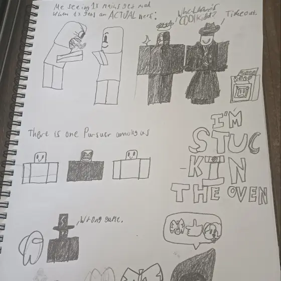 MORE forsaken doodles heres the incomprehensible speech translation: Reaper taph: [schmuck taph emoji] 👈🐶 (schmuck is a b---h) Spectre: wrong game. Noli: whe-where's c00lk-kidd? Mafioso: Timeout. c00lkidd: I'M STUCK IN THE OVEN (that isn't incomprehensible but it is funny) Me seeing 1x mains get mad when 1x gets an ACTUAL nerf: There is one Pursuer among us