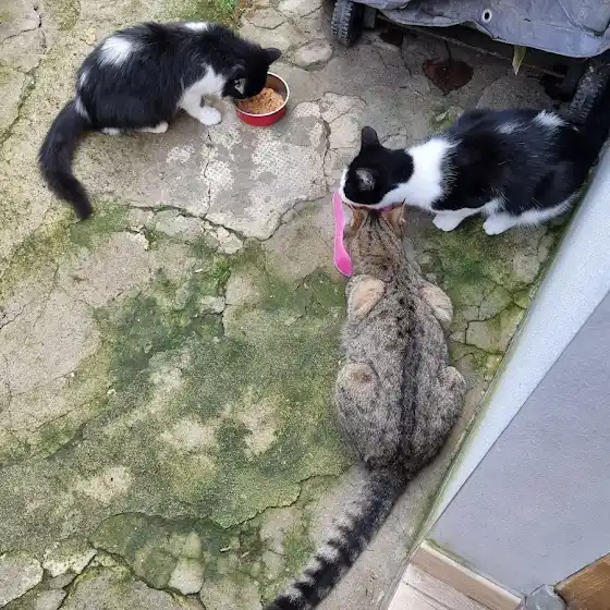 feeding my strays Bicro, Gufo and the little fluffy scrawny guy who joined recently and now he's growing bigger than the two π₯°π₯°π₯°