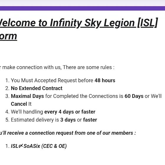 Hello... For now, I’m still setting up my Discord server... Anyone can join, even if you’re not part of the alliance, and you’ll be able to request connections there... This allows for much faster connection handling, possibly on a daily basis, since we have our own task division for every incoming request...