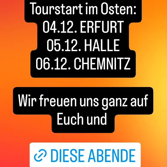 1. Danke für das tolle, lange AJZ-WarmUp- Wochenende in Hellersdorf, Neubrandenburg und Ribnitz. Hat uns und offensichtlich allen Anwesenden gut getan. Freitag ist noch Neumünster dran (ausverkauft). Wir sind warmgespielt und freuen uns auf die "Im Zenit"-Tour. 2. Tourstart ist am 04.12.! Das Set dafür macht tierisch Spaß, wir empfehlen uns und den Ticketerwerb einfach mal (herzlichst) selbst. Soll ja Orte geben, wo Tickets auch mal knapp werden aber was wissen wir schon. 3. Donnerstag 20:00 Uhr kommt "Grußwort Part 2". Wer das erste Grußwort gesehen und gehört hat, weiß also: es gibt Rap-Rap-Rap mit Video. 4. Checkt @haschi__ und @a_quasselstrippe , die waren unser Support (+ Admiral Adonis) am WE und sind Granaten 5. Schönen Start in die Woche uuuund: