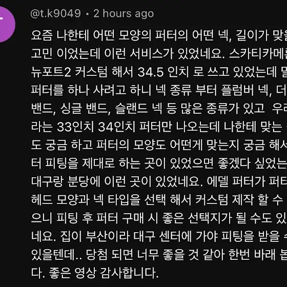 영상 보시고 댓글 이벤트 참여하시면 엄청난 경험을 하실 수 있습니다! 에델 클럽이 아니라도 누구나 이벤트 참가 가능하시고, 피팅또한 본인 퍼터로 가능합니다. 모두에게 오픈 되어있으니 꼭 응모하세요! 댓글 임의 추첨이니 댓글 내용이 감동스러울 수록 당첨 기회가 높아집니다.