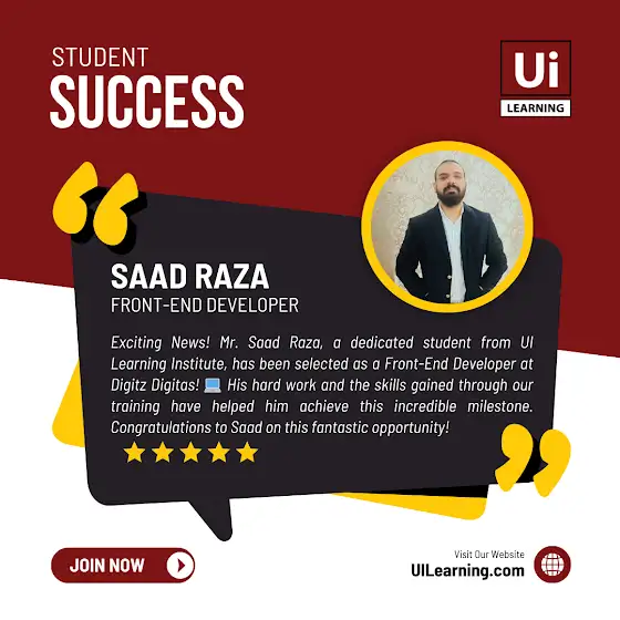 Exciting News! Mr. Saad Raza, a dedicated student from UI Learning Institute, has been selected as a Front-End Developer at Digitz Digitas! His success highlights the strength of our Web Development Course, which offers: