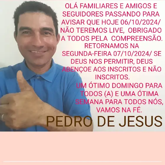 Boa tarde O CANAL TIRÁ UM TEMPO PRA DEUS, avisa que hoje 06/10/2024/ não teremos Live retornamos na Segunda-feira, se Deus nos permitir que todos tenham um ótimo Domingo e uma excelente Semana abençoada por Deus.