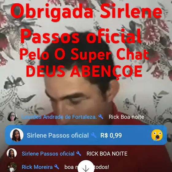 Mais uma vez agradecemos a Sirlene Passos oficial por Comprar o Super Chat Deus continue te abençoando sempre , obrigada por estar sempre apoiando o nosso trabalho Deus abençoe a todos 🙏🙏🙏🙏👍🤝