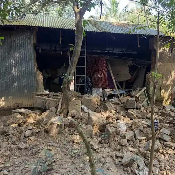 ছবিটি ঘোড়াশাল খলাপাড়া এলাকায়; ভূমিকম্পে মাটির ঘরও পড়ে গেছে এমন।