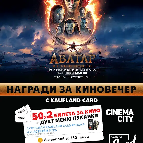 Активирай купон за 150 лоялни точки и участвай за шанс да грабнеш два билета и дует меню пуканки за „Аватар 3: Огън и пепел“. 🌌🔥