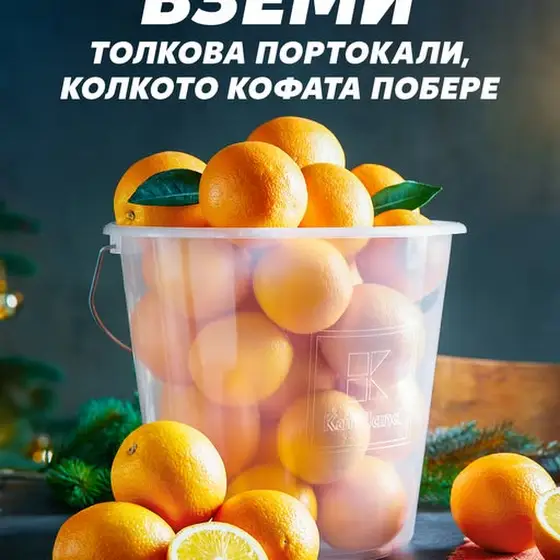 Отвори вратата за свежа Коледа! 🎄 Грабни толкова портокали, колкото кофата може да побере. 🍊🧺 Офертата те очаква в Kaufland. 🎁