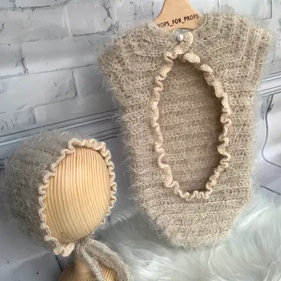 Вот такой комплект я изначально вязала в качестве реквизита для фотосессии новорожденных. Но сделала неверные расчеты, хотя данные брала из интернета, и комплект получился на малышку постарше.