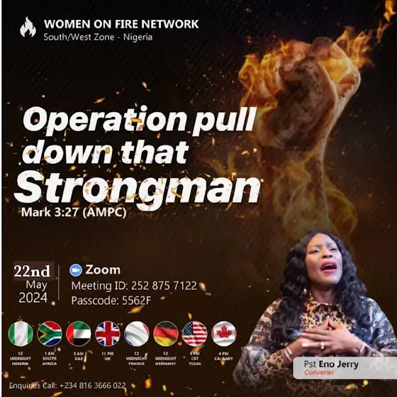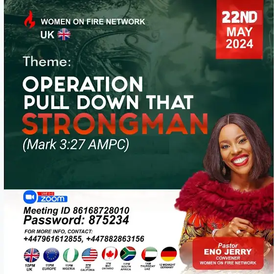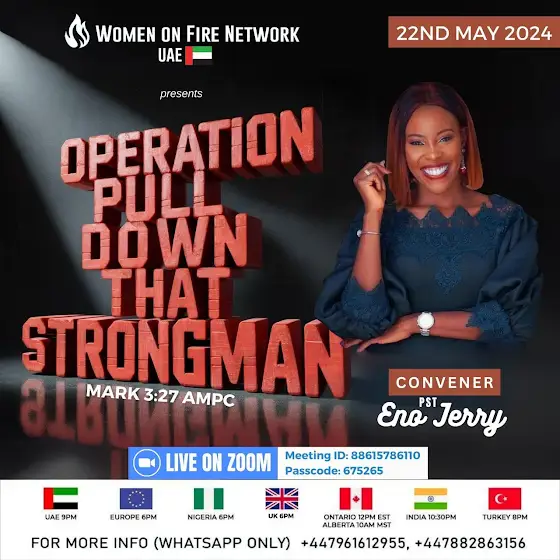 My name is Eno Jerry, Chief steward of the Women on Fire Network(WOFN), wife of Pastor Jerry Eze, convener of the New Season Prophetic Prayers and Declarations(NSPPD) and Lead Pastor of Streams of Joy International.