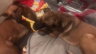 Sleepy/moody German Shepherd fusses at her sister