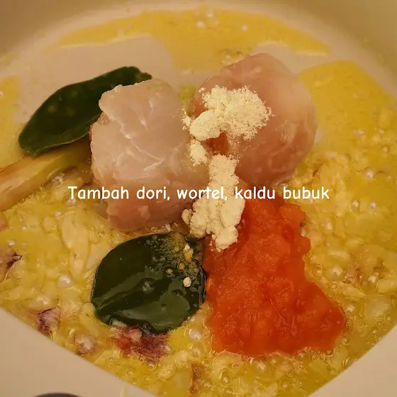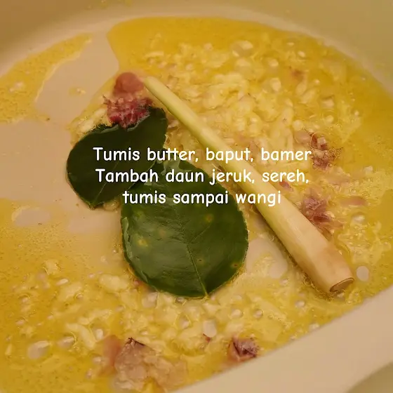 Telur Kukus Dori Tomat 1 telur 80 ml kaldu ayam 1 gr kaldu bubuk 15 gr butter 60 gr dori 1 baput 1 bamer 20 gr tomat 2 daun jeruk 1 sereh 80 ml kuah kaldu 2.5 gr kaldu ayam bubuk