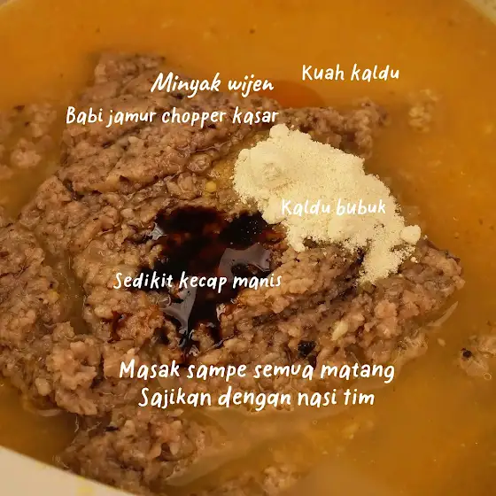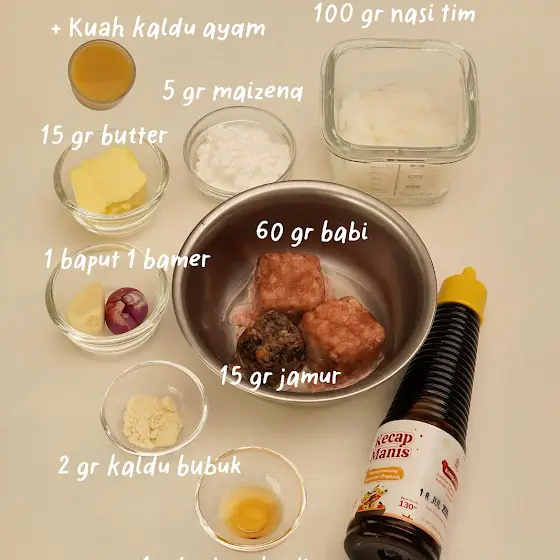 100 gr nasi tim 15 gr butter 1 baput 1 bamer 60 gr babi 15 gr jamur 5 gr maizena 2 gr kaldu bubuk 80 ml kuah kaldu Sedikit kecap manis 1 ml minyak wijen