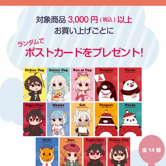 購入特典:対象商品、税込3,000円以上のお買い上げ毎にポストカード(全14種)をランダムで1枚プレゼント🎁