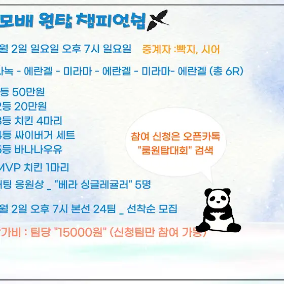 2월2일 7시부터 6라운드100만원 상당 상금과 상품으로 룸원탑대회합니다!참가신청은 카톡에 룸원탑대회 검색또는 아래링크로 들어오시면 됩니다!!선착순으로 24팀 받으며팀당 15000원 참가비 받고 진행합니다!룸원탑대회 신청방 #빡지룸대회open.kakao.com/o/gUvpMC9g