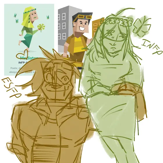 Quick sketch of my oc and me as our personality types 😛