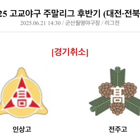 <⚠️ 경기 순연 안내 및 중계 예고>금일(21일) 전주고와의 주말리그 후반기 6R 경기는우천으로 인해 내일로 순연되었습니다. ⏰ 2025. 06. 22 (일) 14 : 30🆚 전주고🏟️ 군산 월명야구장 ✅ 생중계 예정