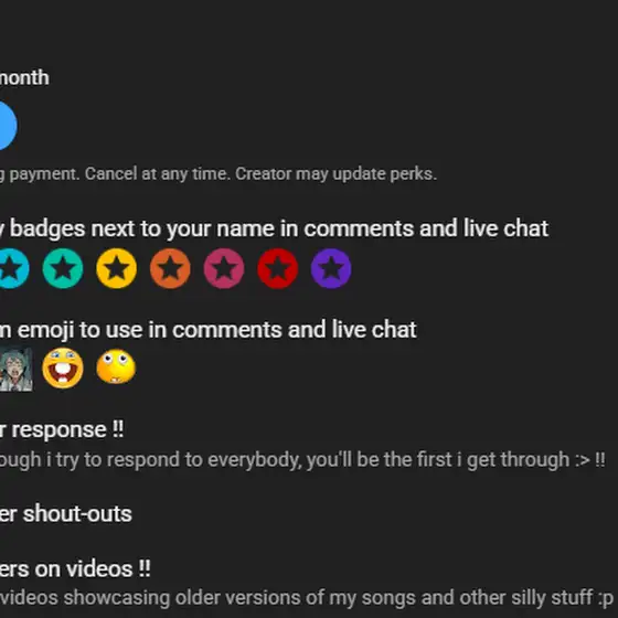hello !! i just opened up a membership thingymabob in case you wanna show me extra support :0 ! you'll gain access to silly emojis and videos showcasing previous version of my songs as well as other things :> !!