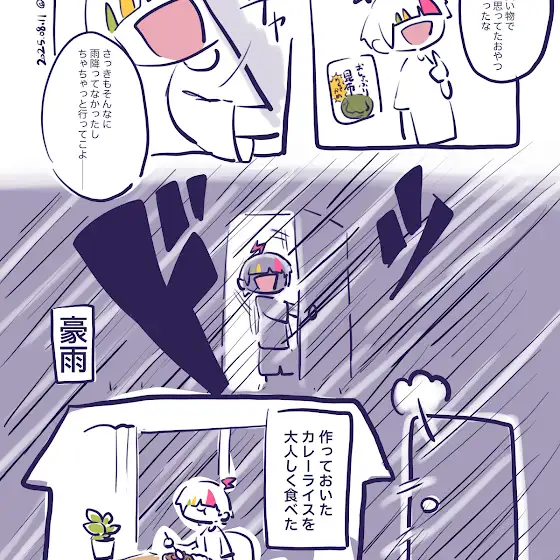 雨すごかったわ2枚目は次の日に再度スーパー行ったらおやつ昆布売り切れてたので、塩バタかまんとじゃがりこを買った絵