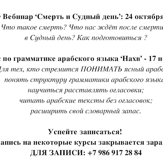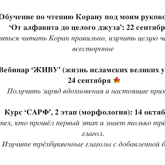 Также я провожу платные курсы с обратной связью по Алфавиту, Таджвиду, чтению Корана, толкованию Корана, разговорному арабскому, грамматике арабского языка (Нахв), Сарф и Сире.