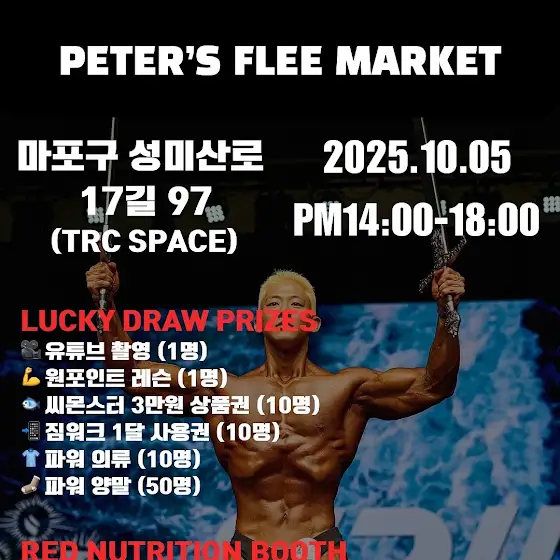 안녕하세요 여러분!내일 유튜브 2주년 이벤트로 플리마켓을 진행합니다100가지 이상의 의류가 준비되어 있으며행사 수익금(운영비 제외)은 푸르메재단 넥슨어린이재활병원 치료 지원에 기부됩니다현장에서는 다양한 이벤트와 경품도 준비되어 있으니 많이 놀러와 주세요!여러분과 함께 선한 힘을 나누는 의미 있는 하루가 될 겁니다🫶🏻⸻조피터’s 플리마켓 안내📅 날짜: 10월 05일 (일) 14:00 ~ 18:00📍 장소: 마포구 성산동 (홍대역 도보 15분)💌 참여 신청 방법: 구글 폼 작성forms.gle/iNeDPniB5JPjzkoS9*당일 신분증 지참 필수선착순 입장 (한 번에 최대 15인) & 1인 2매 제한되는 점그리고 행사가 조기 종료될 수 있다는 점 양해 부탁드립니다