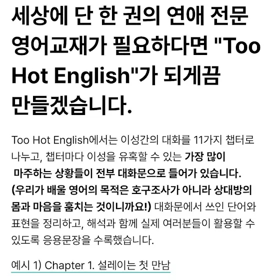 🔥 글로벌 썸, 이제 영어 때문에 놓치지 말자. 👉 Too Hot English — 당신의 영어가 매력으로 바뀌는 순간. ✨ 더 짧은 버전 (유튜브 커뮤니티 글용) 💋 글로벌 연애/썸/DM 영어, 어디서 배우냐고? 👉 이번에 와디즈에서 전자책으로 공개합니다✨ 실제 데이트/플러팅 상황에서 바로 쓰는 문장으로만 구성!