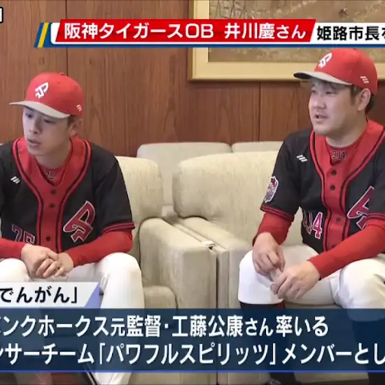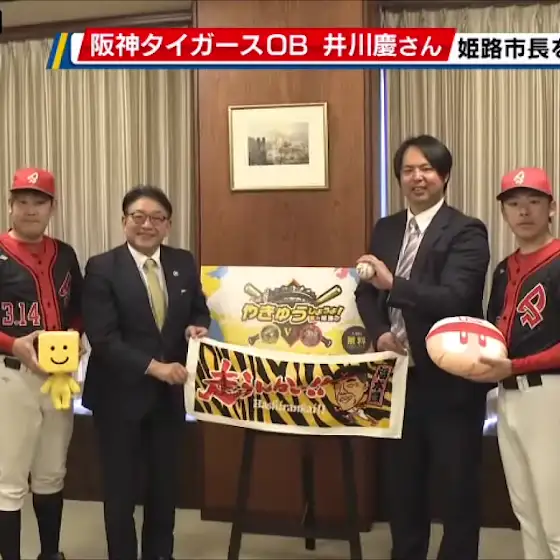 3月20日(木・祝)に開催される「パワフルスピリッツvs熱血!タイガース党」に出場予定のでんがん、こーくん、井川慶さんが清元秀泰姫路市長を表敬訪問。