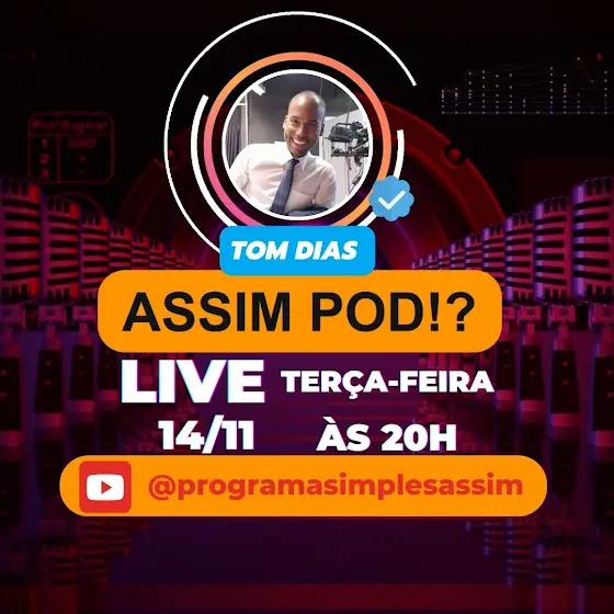 Espisódio número 03 - TOM DIAS, jornalista da TV Tem é o nosso convidado nesta terça-feira, dia 14 de novembro. Vamos conhecer um pouco mais deste jovem de voz potente e sorriso fácil, que está brilhando nas telas da maior rede de tv do Brasil. Nosso podcast começa às 20h, ao vivo, pelo canal Simples Assim no youtube. Esperamos você!