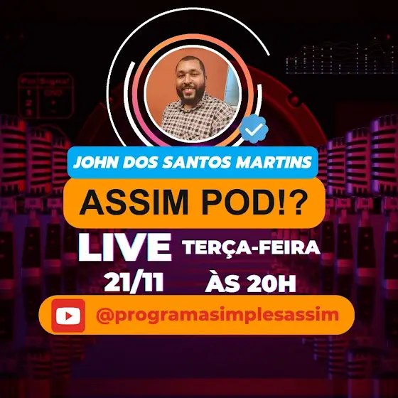 Nesta terça-feira, dia 21 de novembro, nosso podcast Assim Pod!? recebe John dos Santos Martins, pastor da Vineyard Catanduva, "faz tudo" no restante do tempo, pai da Ana e marido da Mari. Vamos conhecer como John equilibra tantos afazeres e ainda se dedica a evangelizar e levar a palavra de Deus ao próximo. Esperamos você, ao vivo, 20h no canal Simples Assim.