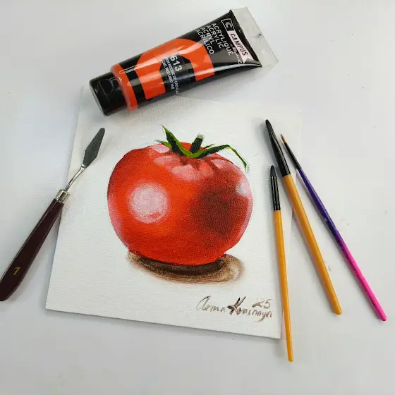 - Делает фото: чай, кисти, холст.