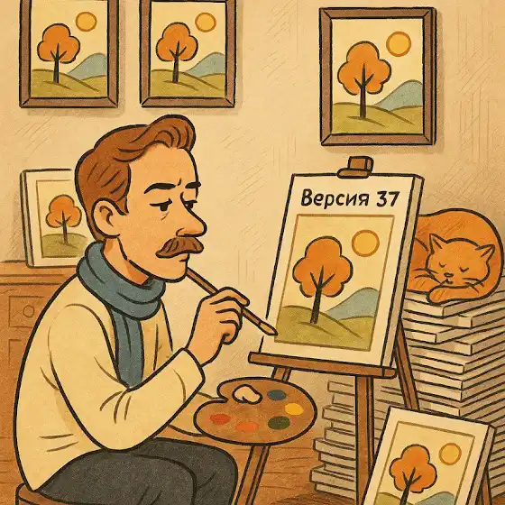 - Переходит на следующую картину до того, как высохнет краска на предыдущей.