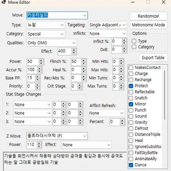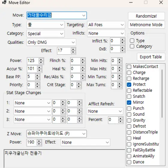 포켓몬 썬&문 개조 5일차 99%얼음 아쿠아제트- 아쿠아제트 강화버전 10%확률로 얼음 걸리게 할수 있습니다.카운터실드 구현- 카운터실드 쓰는 포켓몬의 타입에 따라 공격 타입이 바뀝니다. 풀죽음 확률 50%도 있습니다.카운터실드로 공격을 못하게 한다는 느낌을 주고 싶었습니다.지우 포켓몬 자력기 전부 수정 완료 했고 지금 테스트 중입니다. XY&Z버전 다 올라가면 썬&문도 올리겠습니다.