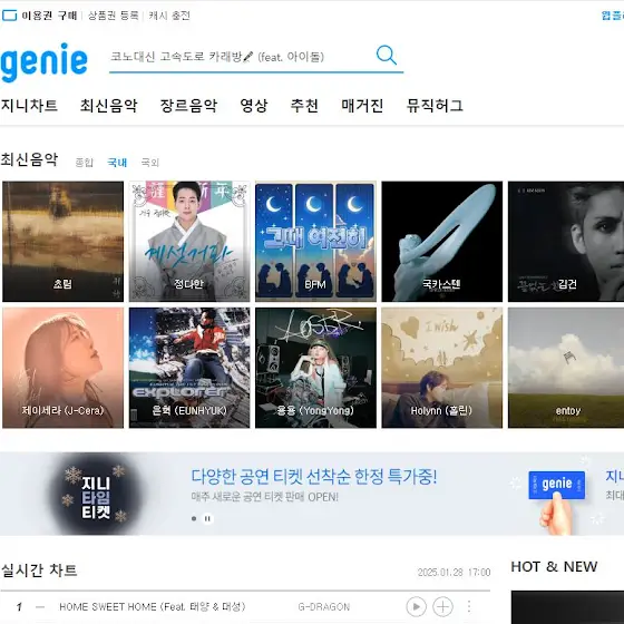 멜론,지니뮤직,벅스뮤직,플로 등 국내 대표 음원서비스의 메인 홈의