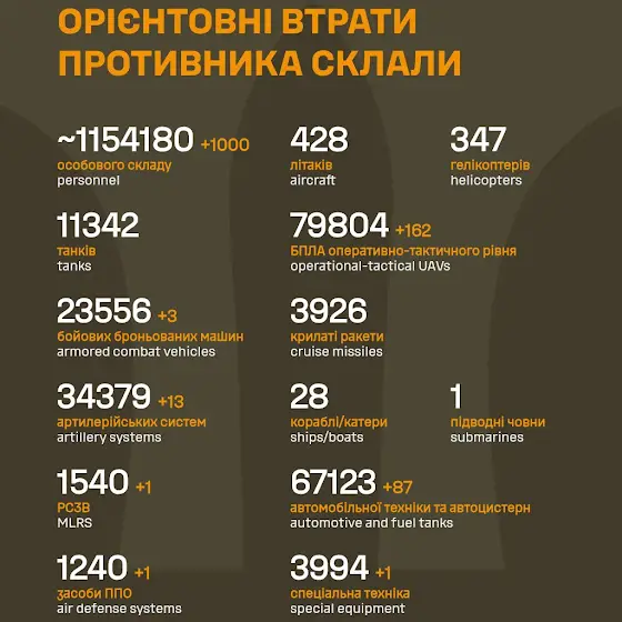 А загалом від початку повномасштабного вторгнення, армія окупантів скоротилася на 1154180 солдатів.