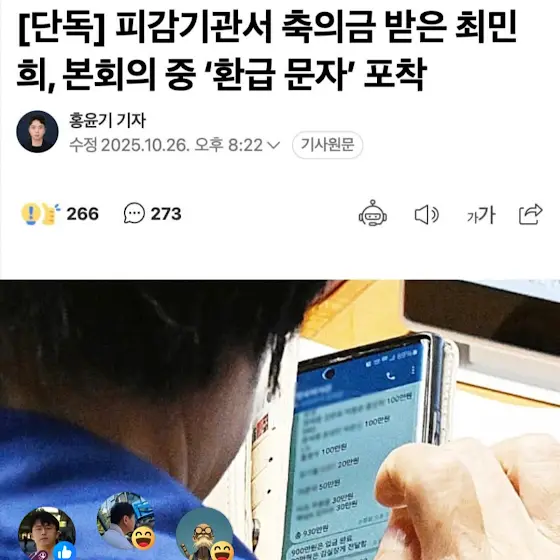 지난 26일 국회 카메라에 잡혀 공개된 최민희 의원 전화 메시지는 보좌진이 동원돼 축의금 환급 하느라 분주하다. 이런 내용이다. 대기업 관계자 4명에게 각각 100만원, 모 과학기술원 관계자 20만원, 한 정당 대표 50만원, 종합편성채널 관계자 2명 각각 30만원, 이동통신사 대표 100만원 등이다.