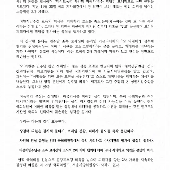 장경태 의원은 피해자에 대한 2차 가해를 중단하고 즉각 국회의원직을 사퇴하라
