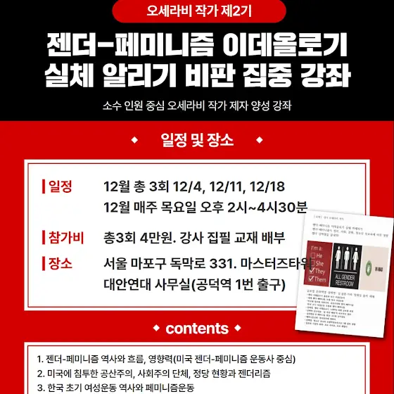 11월 제1기는 알차게 진행되었습니다. 젠더 이데올로기 비판에 심혈을 기울여 집필한 교재도 준비돼 있습니다.