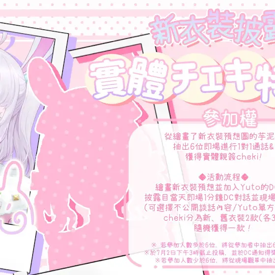 【🐰新衣裝披露日期決定🐰】 大家有沒有來Yuto的半週年紀念歌回呢?🥺 是的!新衣裝披露日期確定了!💦 📣2022.07.02 19:00📣為感謝繪畫新衣裝預想圖的芋泥, 7月2日的新裝披露直播中會舉行特典會 ※活動詳情請參閱下圖 繪畫新衣裝預想圖請使用這個TAG୨୧♡♡TAG♡♡୨୧ #Yuto新衣裝猜想 ୨୧♡♡TAG♡♡୨୧ #Yuto新衣裝 #新衣裝猜想 #重大告知